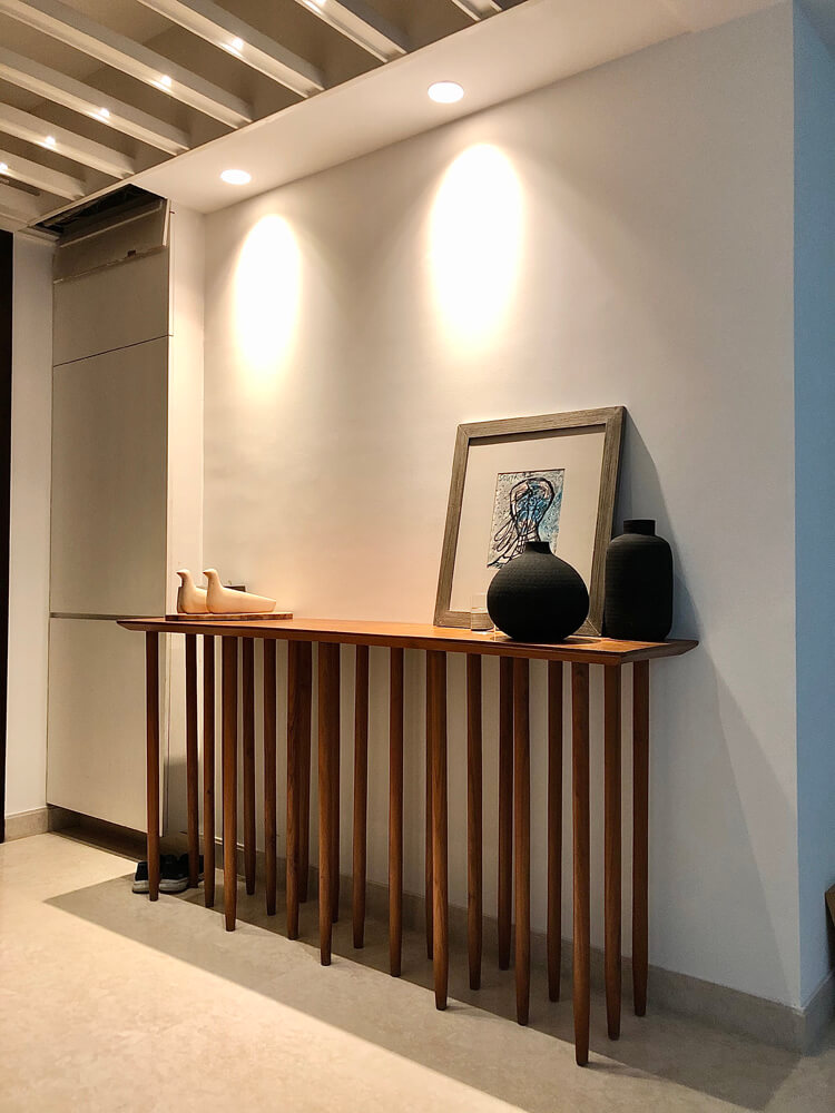 the architect took an avant-garde direction. rich raw silk panels were juxtaposed with cement walls, modern pendant light and an eclectic display of modern art installed along with exposed brick walls and ribbed wooden paneling.