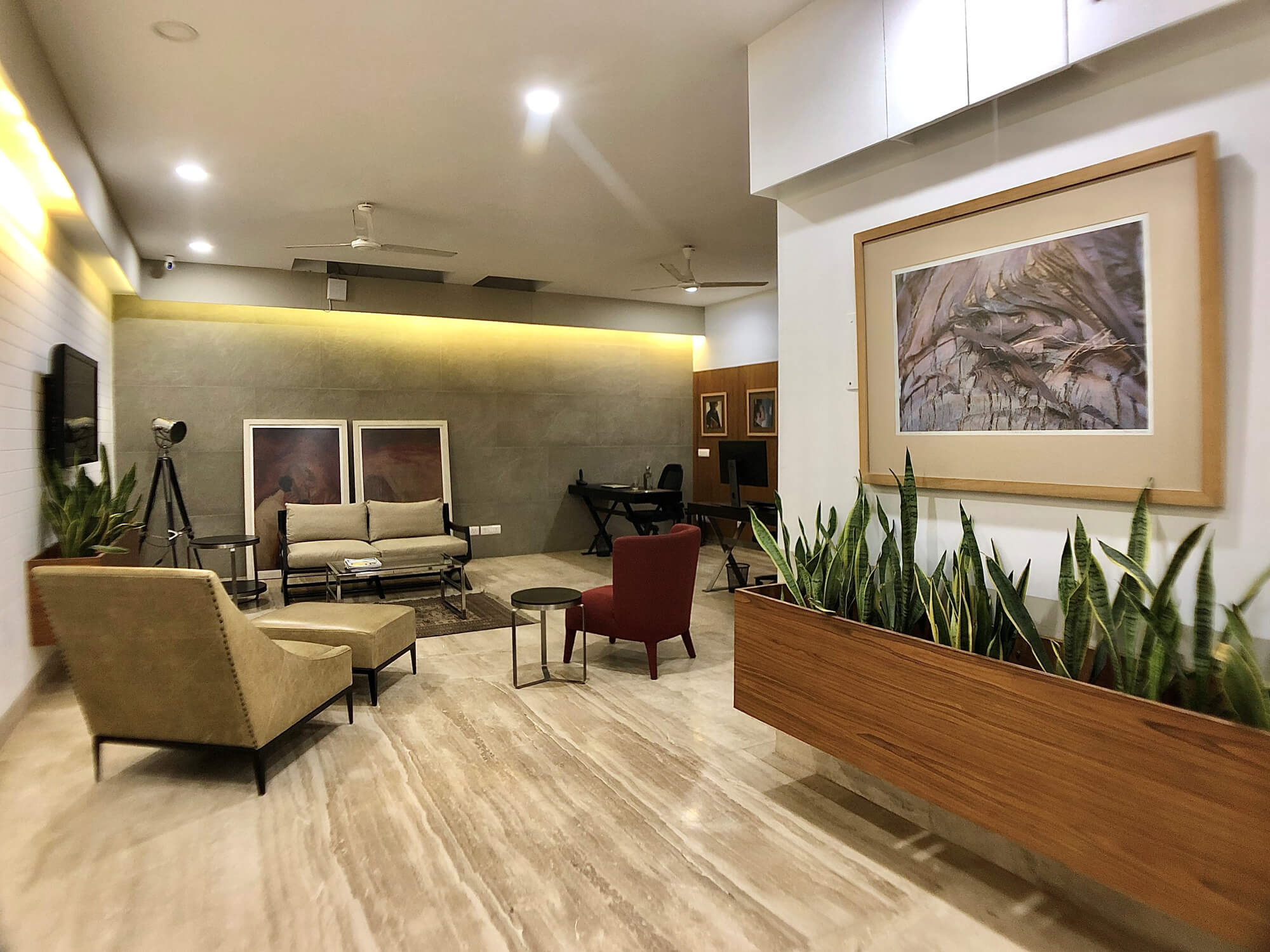 a subtle subtext speaks of dynamic, shifting situations. it is made evident in the choice of movable wood and steel office desks, the conference table and even the light classic modern furniture in the informal meeting area.